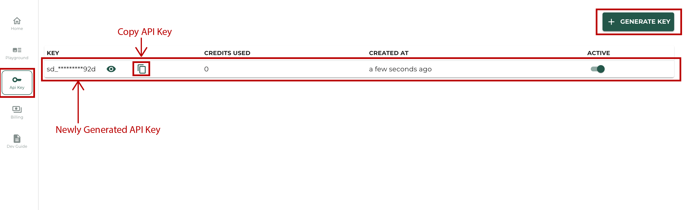 - Copy the recently generated API key for authentication in your API calls.